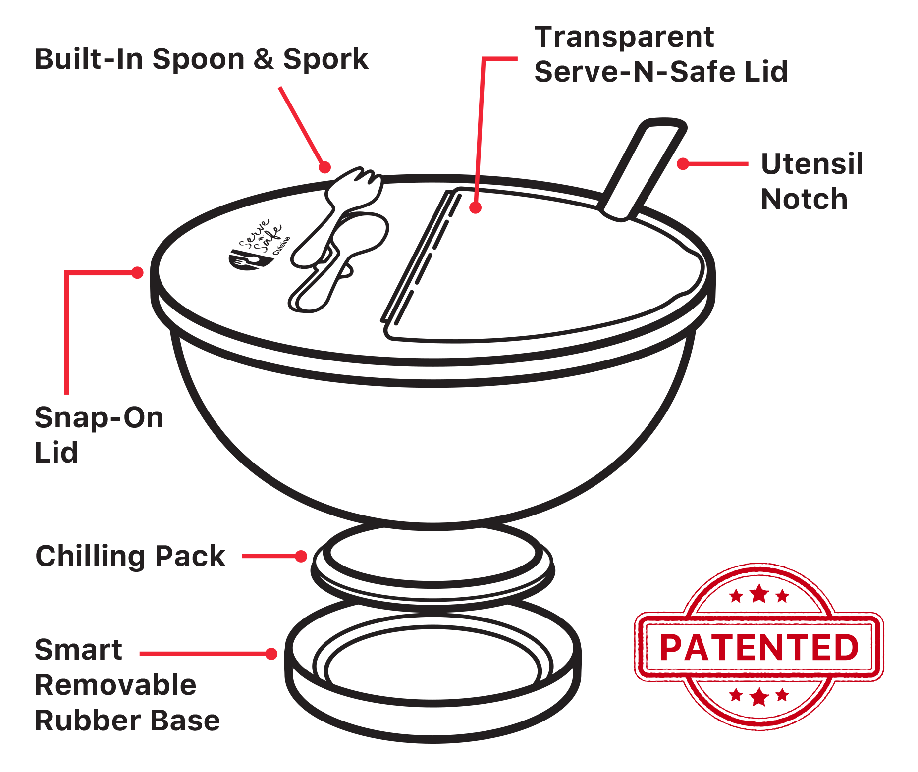 Our innovative smart removable rubber base design accommodates a chilling pack (included), ensuring your cold dishes remain chilled longer. The first of its kind.